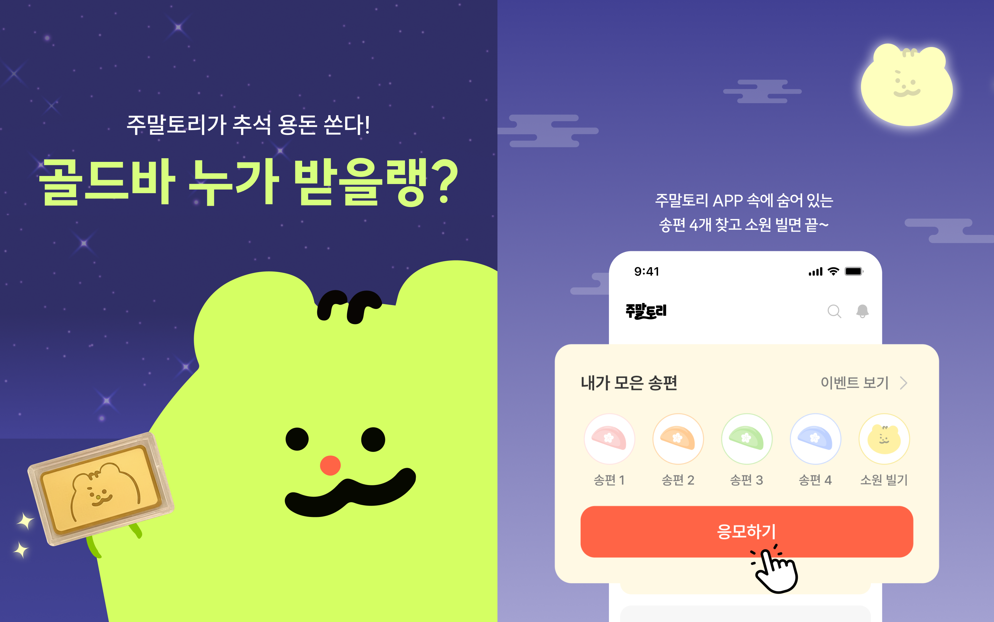 ์ถ์ ์ฉ๋ ๋ฐ๋ ์์ ์ ์ง๋, ์ด์ ๋ ์ฑ๊ฒจ์ค์ผ ํ๋ ์ด๋ฅธ์ด ๋ ์ฐ๋ฆฌ๋ค๐ ๊ทธ๋์ ์ฃผ๋งํ ๋ฆฌ๊ฐ ์ค๋นํ์ด. ๋ฐ๋ก ์กํธ ๋ชจ์ผ๊ธฐ ์ด๋ฒคํธ! ์ผ๋ง ์ ๋ฐ๋๋ฐ๋ํ๊ฒ ์ถ์๋ ์ฃผ๋งํ ๋ฆฌ ์ฑ์์ ๋ค ๊ฐ์ง ์กํธ์ ๋ชจ์ผ๊ณ , ๋ณด๋ฆ๋ฌ์ ์์ ๋น๋ฉด ๋. ์ฐํด ๋์ ์ด๋ ์ค์ด๊ฑฐ๋ ์ ๊น ์ฌ์ฌํ ๋ ๊ฐ๋ณ๊ฒ ์ฆ๊ธฐ๊ธฐ ๋ฑ์ผ ๊ฑฐ์ผ. ํน์ ์กํธ์ด ์ ๋ณด์ธ๋ค๋ฉด? ๊ฐ์กฑ, ์น๊ตฌ๋ค๊ณผ ๊ฐ์ด ์ฐพ์๋ณด๋ ์ฌ๋ฏธ๋ ์ ์ ํ ๊ฑฐ๋ญ! ๊ฒ๋ค๊ฐ ํ ๋ฆฌ๊ฐ ๊ฐ์ธ๋ ํ์ ํ ๊ณจ๋๋ฐ๊ฐ ์ ๋ฌผ๋ก ๊ธฐ๋ค๋ฆฌ๊ณ ์์ผ๋, ๋ญ๋ญ์ด๊ฐ ์ด๋ฒ ์ถ์ ํ์ด์ ์ฃผ์ธ๊ณต์ด ๋์ด๋ณด๋ญ (์ฃผ๋งํ ๋ฆฌ์ ํจ๊ป ๊ธํ